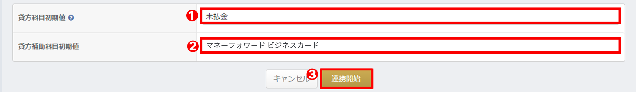 3.カードを利用した際の「❶貸方勘定科目」および「❷貸方勘定補助科目の初期値」(STEP1で設定した貸方科目)を設定し「❸連携開始」をクリック