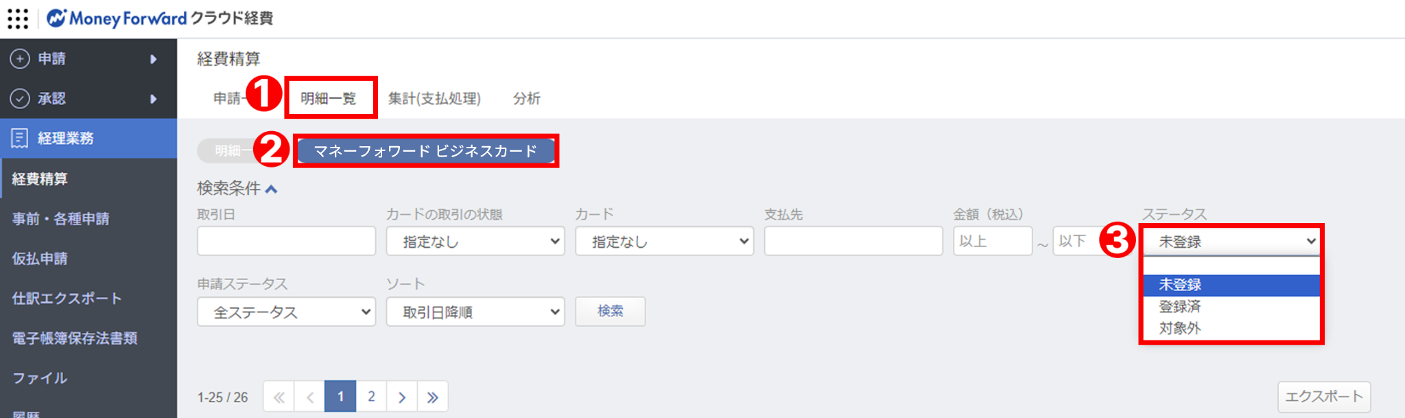 2.「❶明細一覧」>「❷カードの選択」>「❸ステータス」をクリックして完了