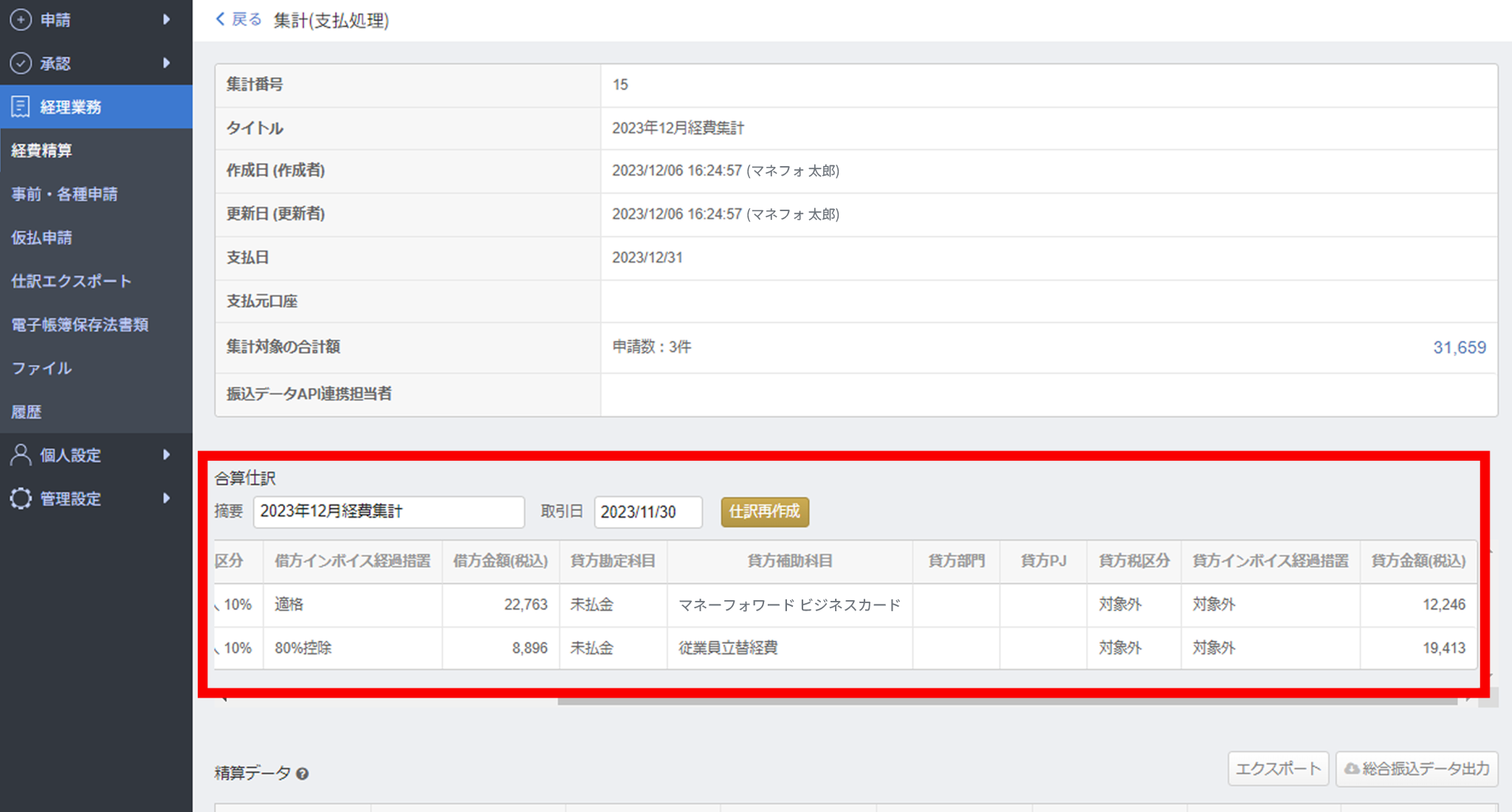 4.従業員立替と法人カード利用の勘定科目ごとに金額が集計し、仕訳が自動で作成されます。