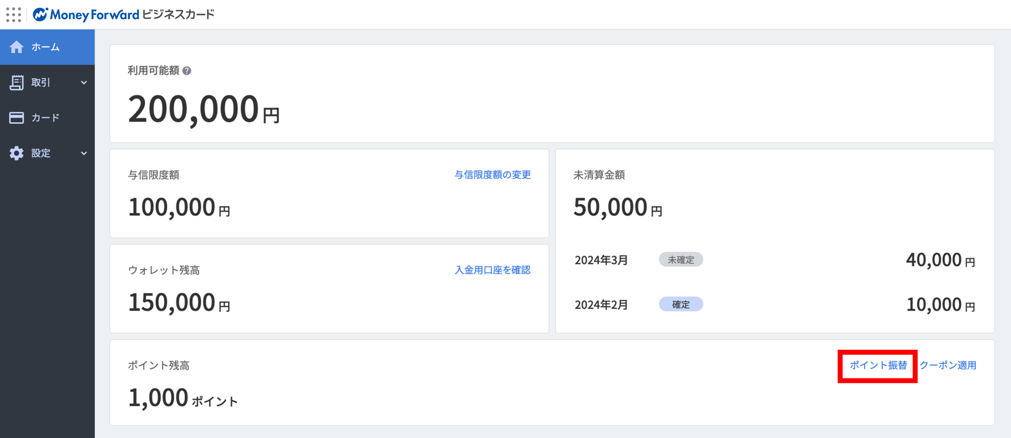 マネーフォワード ビジネスカードで貯めたポイントは、ポイント振替を行うことで支払いに充てることができます。