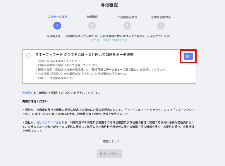 マネーフォワード Pay for Businessの画面に戻り、与信審査ページの「確認しました」のチェックを押し次ページに進みます。